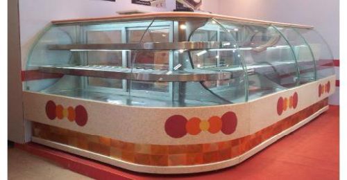 Product Specification • Beautiful L shaped bend glass counter to display variety of snacks, sweets, cakes or pastries.• 2 - 3 glass shelves to display at various levels.• Powerful efficient cooling.• Stainless steel structure.• Granite or Marble top with same matching front panel.
