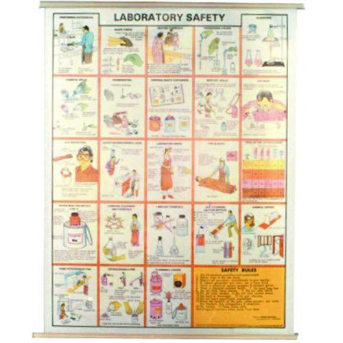 A wall mounting chart printed on polyart plastic sheet fitted with plastic rollers, illustrating vital safety precautions in laboratories. The chart is essential for displaying in school laboratories where students are being introduced to various types of laboratory work.