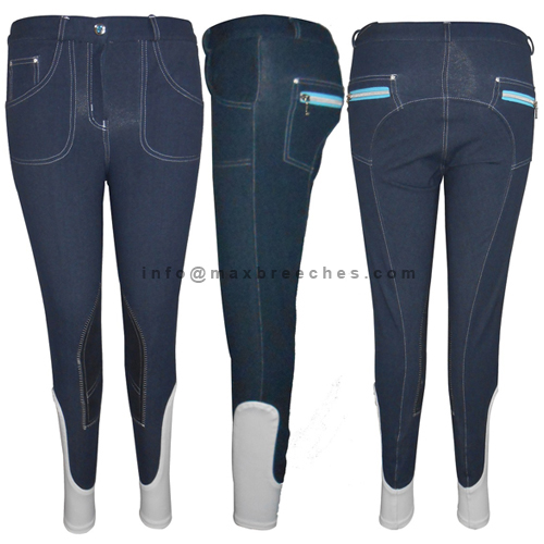 Contact SupplierLadies knitted denim melange fashion breech blend made of polyester cotton clarion knee patch two front jeans pocket with ticket pocket and contrast details back two pockets with contrast zip pocket details and contrast lycra at the bottom, crystal decoration on the ticket and back pockets.Ladies Real denim breech with exotic fashion washed treatment for the riding as well as fashion trend which feel the casual look of equestrian.Ladies woven strong breech made of polyester and viscose blend with very strong technical fabrication for the style and comfort two front zip styles pocket and decorative long knee patch and contrast flexi at the bottom. This is real combination slightly hidden fashion of riding.Ladies real denim fashion horse riding breech for the young ladies which always looking for the new fashion and hot show up during horse riding.Ladies horse riding breeches made of Nylon spandex with very thin material to feel extra light at the time of long riding with decorative long lasting crystal bling’s and strong seat in builds which makes the nice combination for the best breeches.Old is gold fashion breech with two tone cotton knitted fabric two front horizontal zip pocket with contrast decoration on the seat and bottom lycra, you can choose this even if in fewer money.Very classic very technical ladies pcs dyed cotton nylon silicon full seat breech. We made it with very after thinking what could be the best in the breeches we have used the grip on the pocket facing to save the things to fall and made the high waist to fit the best in the waist during the ride.We promise that you will love and voice will come “Wow” This is the proper blend of fashion and classic, we made the every part of very fantastic treatment to making it to look good. Embroidery, printing and lycra, grip, bling everything most concept is the made in this silicon full seat Breech.Ladies sleepy classic with its colour and design we made it on proudly. Two front horizontal slash pocket with herringbone greys tape and two back cut pocket with contrast tape and button lock, bias waist with leather logo on the back, silicon knee patch with strong grip contrast classic flexi at bottom.