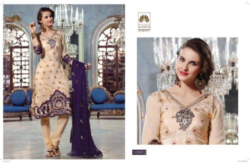 We are offering Ladies Designer Suit. Beige color bamber georgette butti kameez with thread work embroidery and zari work with rich purple daman border and matching beige shantoon bottom and contrasting purple dupatta with embroidery and border.