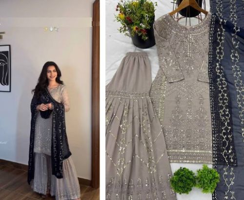 Ladies Grey Georgette Designer Party Wear Palazzo And Suit Set