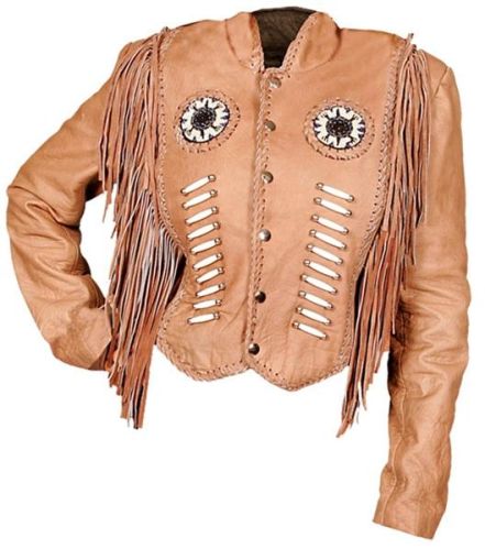 Ladies Leather Bone, Beads & Fringe Jacket A brand new ladies' distressed brown fashion jacket with braid and fringe detail on the front & back. Our new medium weight, top grain leather jacket includes a unique bone and bead scheme running vertically.