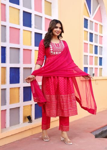 Ladies Pink Nayra Cut Kurti Set M, Xl