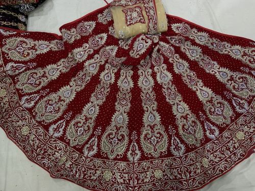 Red velvet bridal fancy hand embroidery lahenga with contrast net set.