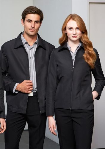 100% polyester shell and lining - fully lined zip front jackets with 2 inside chest pockets and side pockets 2 way zip front inside zip access for embroidery available in black only modern fit also available in a mens jacket.