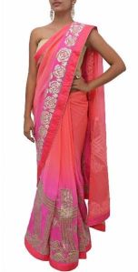 feature Shaded coral and pink saree with gold lame floral patchwork embroidery detailings. Perfect saree for a cocktail event. Fabric - Georgette Unstitched Blouse