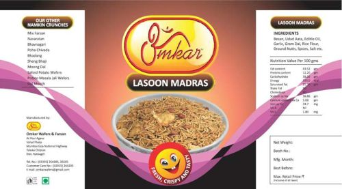 Lasoon Madras Namkeen, offered by us, is made from premium besan, black-pepper, tamarind, South Indian spices and peanuts. We are counted among the top Manufacturers and Suppliers of Lasoon Madras Namkeen from Maharashtra, India. We provide Madrasi Mixture Namkeen in air-tight packaging material so as to retain its quality and purity. We make available Lasoon Madras Namkeen in dofferebt sizes of packets.Ingredients : Besan, Udad Aata, Edible Oil, Garlic, Gram Dal, Rice Flour, Ground Nuts, spices, Salt etc.