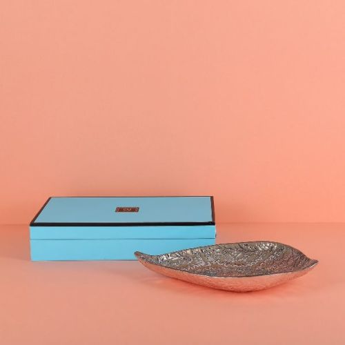 DESCRIPTION Inspired by nature, designed like a gem to adorn your dining table for all your lavish meals. You can also use this as a decorative piece for your corners. The foil work on it makes it look like an antique piece. COLOR Silver SIZE 38X36