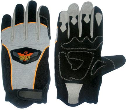 We are offering leather gloves-1005 mechanics gloves made of synthetic leather, spandex, synthetic leather forchette ,neoprene cuff, grippy material on thumb, double palm with padding on palm.