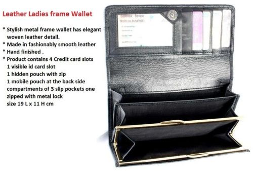 The company has come up as a major Exporter of Leather Ladies Frame Wallet. The Stylish Leather Ladies Frame Wallets have a metal frame made up of elegant woven leather. The Leather Ladies Frame Wallet is made from fashionably smooth leather and is competitively priced. The company offers the finest Hand Finished Leather Ladies Frame Wallets to the clients. Contains 4 credit card slot1 visible ID card slot1 hidden pouch with zip1 Mobile pouch at the back sideCompartments of 3 slip pockets zipped with metal lock Size : 19L × 11H (in cm)