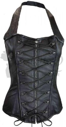 Leather ladies halter top corset with zipper and laces this halter top corset is made from lambskin leather. Authentic wired steel boning 100% cotton lining to make the fit more comfortable. Antique ykk zipper. Laced front over the top of the zipper. Back laces color: