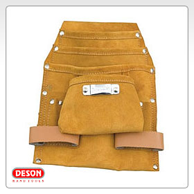 1 Large Pocket,1 Medium Sized Nail Pockets" 2 Small Side Pockets " 1 Leather Hammer Loop " One Metal Movable Hammer Holder" Wide Belt Tunnel Slot