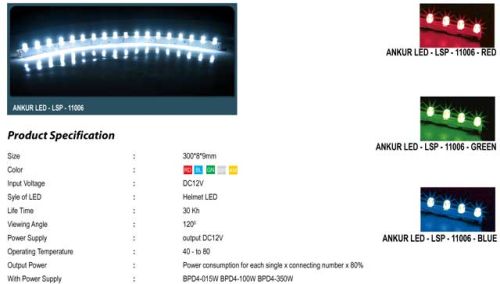 We are offering Led Light. Specifications Size : 300*8*9mmColours : Red, Blue, Green, White, YellowInput Voltage : DC12VStyle of LED : Helmet LEDLife Time : 30KhViewing Angle : 120oPower Supply : Output DC12VOperating Temperature : 40 to 80Outout Power : Power Consuption for each single x connecting number x 80%With Power Supply : BPD4-015W, BPD4-100W,