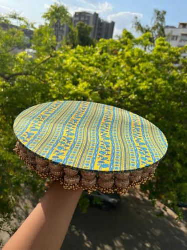 IBHI's design ideology starts with versatility and ends with matching all aesthetics. The tasseled danglers of this platter add the correct amount of bling, it is versatile and matches vibes of all occasions. The Dangler Platter can be used for placing invitation cards, as ring ceremony platters, for serving sweets, placing idols of gods & goddesses and much more! The basal diameter of the dangler plaller is 14 inches and tassel length up to the beads is 3 inches. This platter has a solid surface below the fabric and can be used for various occasions. The beads of the platter are made using wood and cylindrical beads with metallic shine are wrapped inside-out.
