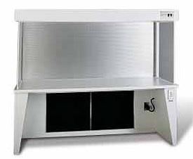 The positive pressure laminar airflow provides product protection within the work area, which is defined by the removable clear acrylic side panels and plastic laminated work surface. Air from within the cabinet is returned to the room through the front access opening.