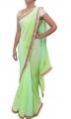 Bright dyed saree in shades of lime green and sky blue. This saree has detailed metal work flowers and highlighted with fuscia pink borders. It comes with Matching unstitched blouse fabric. Fabric-GeorgetteÂ