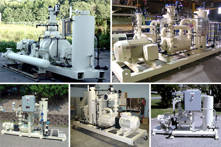 Liquid ring vacuum pumps have been employed for removing air from steam surface condensers and industrial processes for over 40 years. They are among the simplest, most reliable method known of pumping gases. A typical vacuum pump Air Removal System for steam condenser service consists of two, identical 100% capacity pump skids. It is common practice to use both pumps simultaneously to evacuate or “hog’’ the condenser to the point where steam