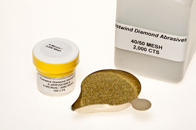 We are distributors of fine quality diamond powders in various meshmicron sizes, i.e. 4050 mesh to 110 micron (250,000 mesh). We also supply diamond coated in 50% copper or 30% to 56% nickel. If you require 60% nickel, it can be special ordered. The diamond powder is available in very weak friable particle for very fast cutting to a strong tough particle for your most demanding application. Eastwind stocks synthetic and natural diamond in a wide variety of specifications. Please inquire.