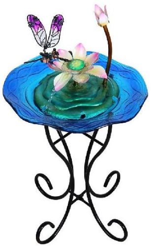 Beautiful fountain with a beautiful blend of glass and metal. The lotus flower and the dragon fly are made of metal beautifull hand crafted and the rest of the fountain is made of glass. The fountain has a metal stand and comes with an electric motor and circulates the water once put in the fountain. This piece is a must have and will brighten up any corner of your home. This is ideal for gifting.