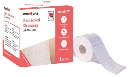 medtopia fabric roll dressing is a single use device composed of non-woven material adhesive plaster that is used to secure wound dressings. product features: good adhesion & gentle on skin hypoallergenic printed grid liner paper core to support handling product material: non-woven fabric size: 10cm x 10cm
