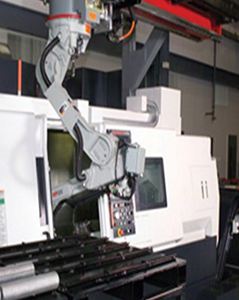This MOTOMAN Machine Tending Robots is equipped with a double gripper unit and is tending a twin headed machining centre. This double gripper reduces cycle times and therefore improves productivity. The robot is used for additional processes such as de-burring adding further value production. The change over between different grippers is entirely automatic using a automatic tool changer.