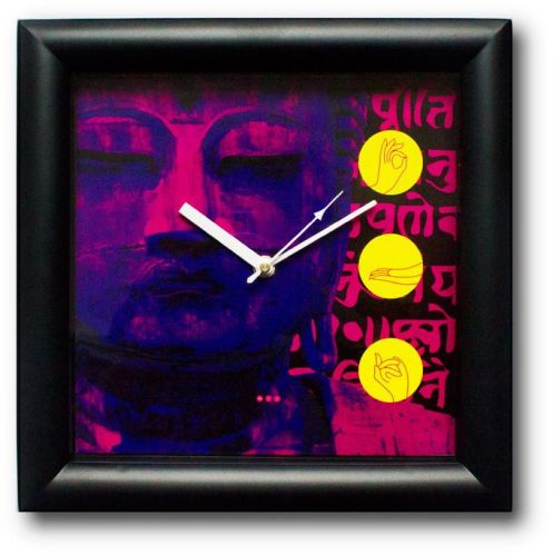 We are offering buddha wall clock.exuding inner calm of gautam buddha, this exquisite wall clock will add a touch of serenity and class to your interiors. shades of magenta and blue evoke harmony and add a pleasant contrast to the deep black background. Bright yellow circles bring alive various mudras used in meditation. Size - 9.5'' x 9.5'' (inches)