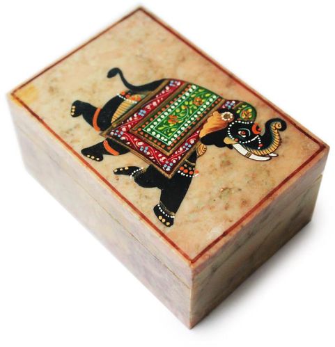 We are offering rectangular softstone box with handpainted elephant. Carrying a distinct indian feel, this lovely soft-stone box portraying a hand-painted elephant makes for a great table piece and also works well to store stuff like chocolates and other tidbits. size - 3'' x 2'' (inches)