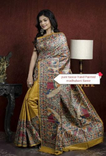 Tussar ghicha silk saree in madhubani hand painted
