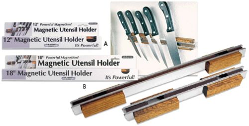 Magnetic knife and utensil holders hold, display and organize knives, utensils and cooking tools with 20 lbs. of pull per inch. Perfect for any kitchen, bar or recreational vehicle. Each features a non-rust, magnetic assembly in a stained wood channel with two mounting screws included.