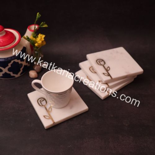 Marble coaster with brass flower with a beautiful stem finely inlayed on the top and highly polished
