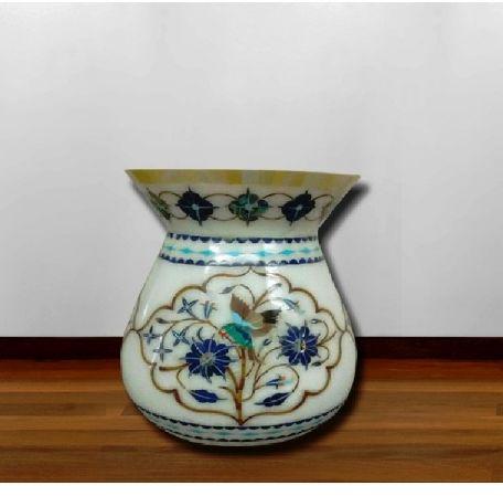 As a gift or even a décor and ornamentation, this wide brim, by an award winner in marble inlay, Flower vase crafted from Makrana marble is marked by a sense of regality due to its milky white exterior enhanced with stone inlay of semi precious stones such as malachite, lapis lazuli, and mother of pearl and turquoise. Its crowning glory is its elegance of design with flawless finish.