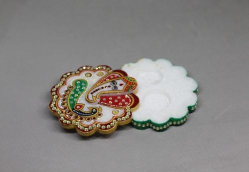Jaipur is known for its marble crafts. The white marble products are hand produced by the artisans and hand-painted. With 2 small grooves for haldi and kumkum, this design is one of the most popular and fast moving product. Secure packaging ensures the product reaches safe at your destination