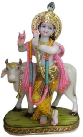 Marble Krishna Statue With Cow, For Worship, Pattern : Plain