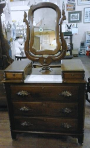 Another of the Southwest Georgia pieces, this walnut dresser has it all. The two glove boxes on top are accented by the smooth marble. The original ornately carved drawer pulls demonstrate the pride in craftsmanship of the mid 1800's when this piece was built. The beauty of the mirror simply crowns this gorgeous dresser.