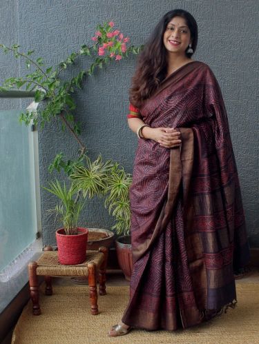 Contact SupplierDiscover timeless elegance with our Modal Silk Bagru Hand Block Printed Saree, a masterpiece from the exclusive Weaves of Tradition Curations Collection. This collection features one-of-a-kind handcrafted sarees, each available in a single unique piece, making it a rare addition to your wardrobe. Crafted using the intricate Bagru hand block printing technique, this saree undergoes multiple stages of printing with meticulously carved wooden blocks, bringing out its exquisite patterns. Naturally hand-dyed, it boasts deep, rich hues that celebrate traditional craftsmanship. Made from luxuriously soft and breathable handwoven tussar silk fabric, it offers a graceful drape, perfect for festivals, special occasions, and workwear alike. Elevate your style with this heritage-inspired, artisanal saree, a fusion of tradition and modern sophistication. Limited edition! Fabric - Handloom tussar silk with zari border. Naturally hand dyed. Bagru hand block printing technique. Length: 6.5 metres with running blouse piece. Width 44 inches. Running blouse piece: 1 metre. Finished with handmade tassels.