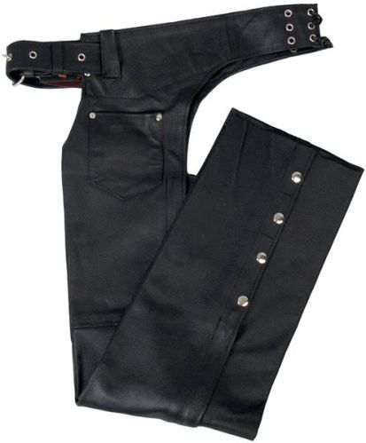 Leather Chaps Classic style leather chaps made with a highly durable, medium weight, top grain leather. These black leather chaps come with a front pocket and have silver hardware including snapping cuffs and a belt buckle. All style avilable.