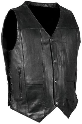 Men's 10 Pocket Leather Vest Soft, cowhide leather, motorcycle vest. This vest has black hardware, side lace, and 10 pockets. One of our newest styles, great for summer riding. All of our leather is handcrafted and sizing may run small.