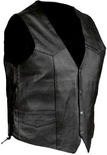 Leather Motorcycle Vest with Side Laces A soft, medium weight cowhide leather vest with satin lining and side laces. This black vest also includes an inside pocket, two front welt pockets, and a front snap closure for a classic biker style.