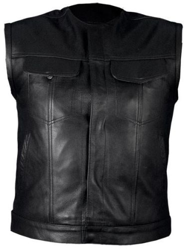 Men's Leather Motorcycle Vest with 10 Pockets Heavyweight cowhide leather vest with satin lining. This superior quality biker vest has a low rise collar, flush, hidden snaps, and a full panel leather back. Perfect for putting a new patch on!