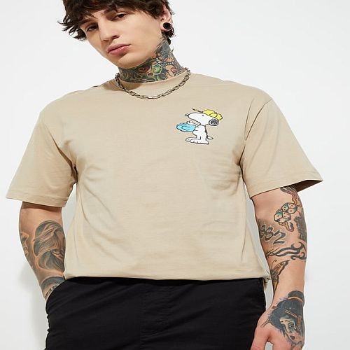 Mens Beige Round Neck Cotton Printed T-Shirt