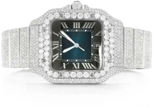 Contact SupplierCartier Santos de Cartier 38mm Silver Tone with - 23ctw Fully Icedout Hip Hop Watch Brand: Cartier Model: Santos de Cartier Dial: White Tone with Date Function Case Size: 38mm Case Material: Silver Tone Stainless Steel with Full Diamond Setting Bezel: Fully Diamond Studded Bracelet: Silver Tone Stainless Steel with Full Diamond Setting Total Carat Weight: 23.00ctw approx. Functions: Date, Hours, Minutes, Seconds Design: Elegant and Classic with Signature Santos Aesthetics Cartier Santos de Cartier 38mm is a breathtaking embodiment of timeless luxury. Featuring a pristine white tone dial with a date function, this watch is adorned with a fully diamond-studded bezel that adds a touch of opulence. The 38mm case and bracelet, crafted in silver tone stainless steel and set with approximately 23.00 carats of diamonds, enhance its sophisticated and contemporary design. This combination of Cartier\'s classic aesthetics with dazzling diamond embellishments creates a statement of refinement and grandeur. Presented in its original box with a warranty card and manual, this Santos de Cartier watch represents the pinnacle of high-end craftsmanship and exceptional style. Experience unmatched elegance with this exquisite timepiece.
