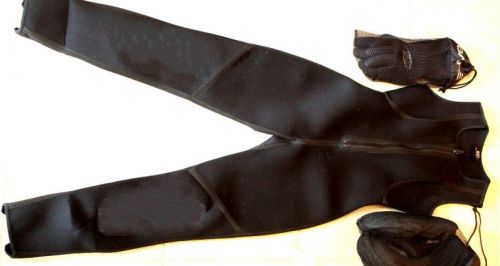 We are offering men's full wetsuit w gloves, boots cold water, snorkeling, scuba diving. Neoprene wetsuit 100% flat locked or glued and blind stitch superlite ultra stretch back panel glide skin adjustable collar zip non-corrosive zipper & velcro zip lock colour co-ordinated stitching duratex stretch knee pads no underarm seams pre-bent knees & elbows free fit ankles with raw edge specific paddle zone new density neoprene for maximum wear