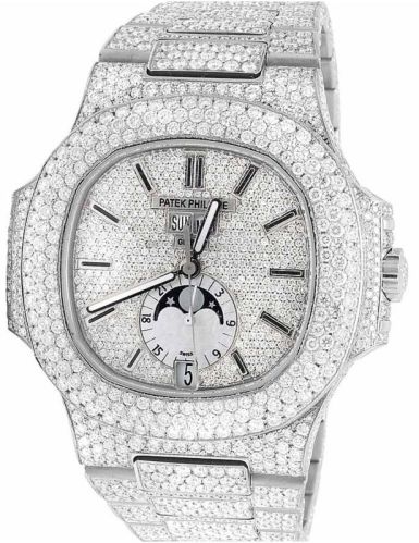 Contact SupplierPatek Philippe Nautilus 40mm Moonphase Diamond Studded Luxurious Watch Brand: Patek Philippe Model: Nautilus Dial: Diamond Studded Silver Tone with Moonphase & Day, Month, Date Functions Case Size: 40mm Case Material: Stainless Steel Silver Tone Bezel: Silver Tone Diamond Studded Bracelet: Full Diamond Studded Silver Tone Stainless Steel Total Carat Weight: Approx. 34ctw Functions: Moonphase, Day, Month, Date, Hours, Minutes, Seconds Design: Elegant Diamond Studded Silver Tone Dial with Moonphase and Comprehensive Date Functions The Patek Philippe Nautilus 40mm Moonphase is a stunning testament to luxury and precision. This exquisite timepiece features a diamond-studded silver tone dial that incorporates moonphase and comprehensive day, month, and date functions. The silver tone diamond-studded bezel and bracelet further enhance its opulent design, creating a harmonious and sophisticated look. This model epitomizes Patek Philippe’s dedication to exceptional craftsmanship and timeless elegance.