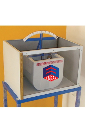 A pontoon is allowed to float in a small tank having a transparent side. Removable steel strips placed in the model for the purpose of changing the weight of the model. Displacement of weight is measured with the help of a scale. By means of a pendulum (consisting of a weight suspended to a long pointer) the angle of tilt can be measured on a graduated arc.