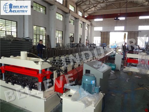 this metal floor decking roll forming machine is used to produce metal floor decks. Main components of this machine are decoiler, guiding and leveling device, roll former, hydraulic cutting device, collecting table, hydraulic station, etc.