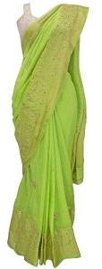 Self check textured saree base. Open weave in a blend of cotton and silk fabric. This saree has the look of a south saree with woven gold borders. It is embellished with gold metal flowers. " danka" rajasthyani work. Unstitched matching blouse is included with the saree. Pure Gold pallu or end. Fabric Silk cotton blend.Â
