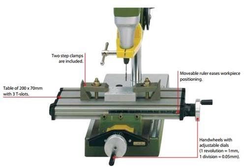 MICRO compound table KT 70 Made of solid aluminium with surface treatment and fitted with adjustable dovetail gibsand three T-slots of the MICROMOT standard (12 x 6 x 5mm). Adjustable ruler eases workpiece positioning. Both handwheels have zero-resettable dials with graduations indicating 1 revolution = 1mm and 1 division = 0.05mm. The clamps and securing bolts for the MB 200, MB 140/S and TBM are included.Other technical data:Table size 200 x 70mm. X travel 134mm and Y travel 46mm, maximum height 43mm.