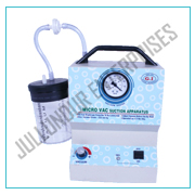 For use in Ambulance Mild steel cabinet. 50 mm vacuum gauge graduated in mm Hg. Oil free diaphragm pump not to be lubricated. -550 mm Hg ± 10% vacuum Capacity 15 LTRS/min. Provided lighter socket cable for use in Ambiance. One JAR of 600 ml (also available in 1000 ml with over flow device).
