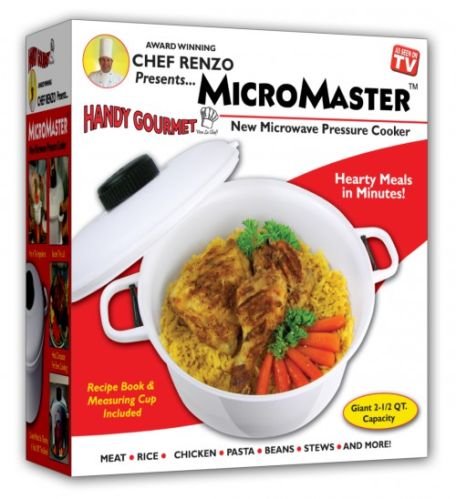 MICROMASTER PRESSURE COOKER Tender, delicious meals in less time! Now you can enjoy the benefits of a pressure cooker with the even faster cooking time of a microwave. Reduces cooking time and locks in natural juices. Simply fill with your favorite recipe and pop it into you ID JC2045 BRAND HGM CASE PACK 12 CASE WEIGHT 11.6 CASE LENGTH 25.7 CASE WIDTH 10.3 CONSUMER PACK 4 COLOR BOX CONSUMER PACK DIMENSIONS 8.25 X 4.75 X 8.5 UPC EAN NUMBER 017874820450