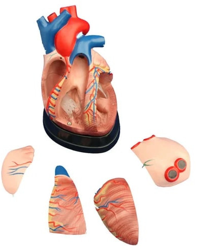 This model shows external features and internal structures of heart and its relation between large blood vessels. Dissectible into 5 parts, 3 times enlarged.